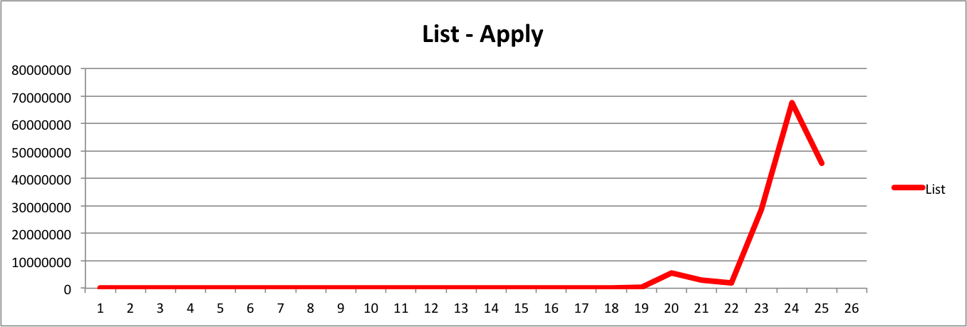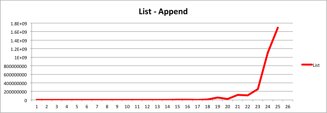 My poor Mac managed to analyse up to collections with 2^27 elements before starting screaming the pain of hell — and that is when I decided to stop!