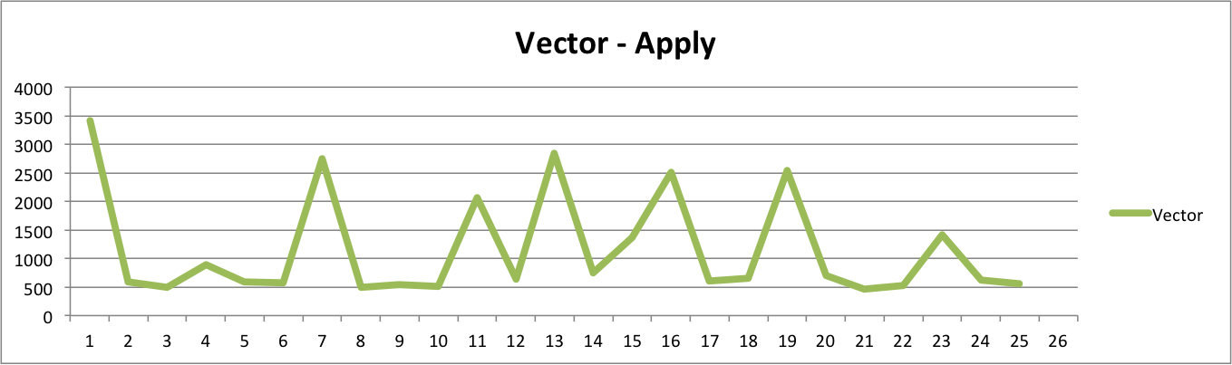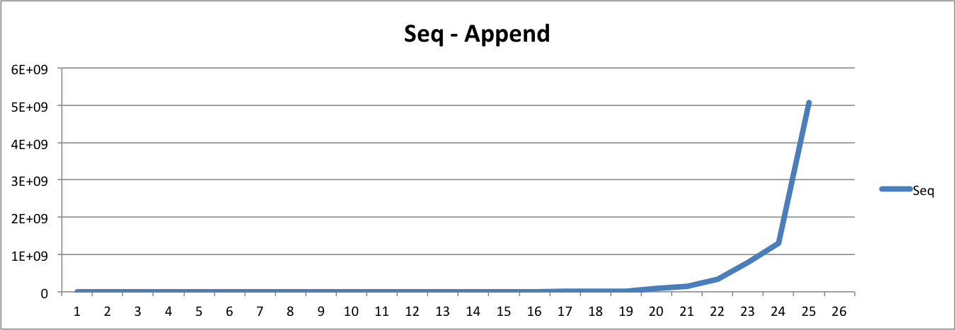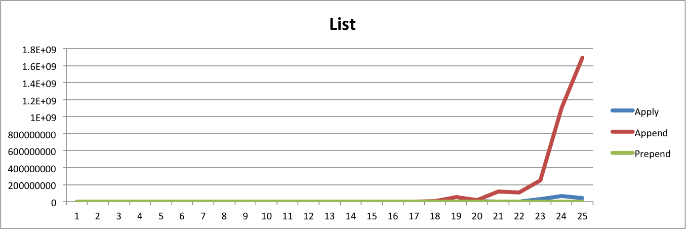 The analysed operation is the apply operation used to access a random object. By looking at thegraphs, we can see that List didn’t perform well. Lists don’t have randomised element access: every time we need to go through the list until we reach the element at the index we are looking for. Although both Seq and Vector behaved quite well, our winner for this round is Seq. None that the default implementation for Seq for Scala 2.11 is based on LinkedLists, while Vectors are implemented using a bit-map with a factor branching of 32 (a weird structure that can be seen as a tree with up to 32 children nodes).