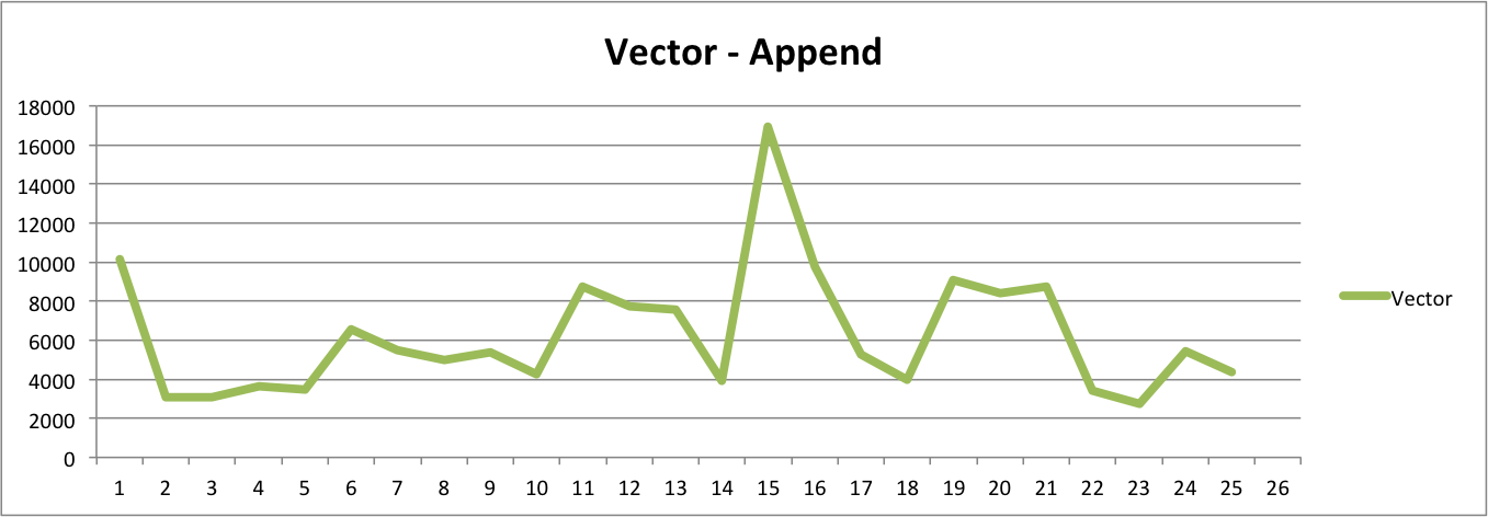 Our experiment consists in creating increasingly bigger collections of random integers and measure the average execution time of a specific operation. The (quick and dirty!) script used and the generated data can be found here. The script was run on a standard MacBook Pro with a 2.8 GHz Intel Core i5 processor. After each iteration, the number of allocated elements has been increased exponentially with base 2. Each operation has been performed 10 times and the average execution time has been considered for the purposes of this experiment.