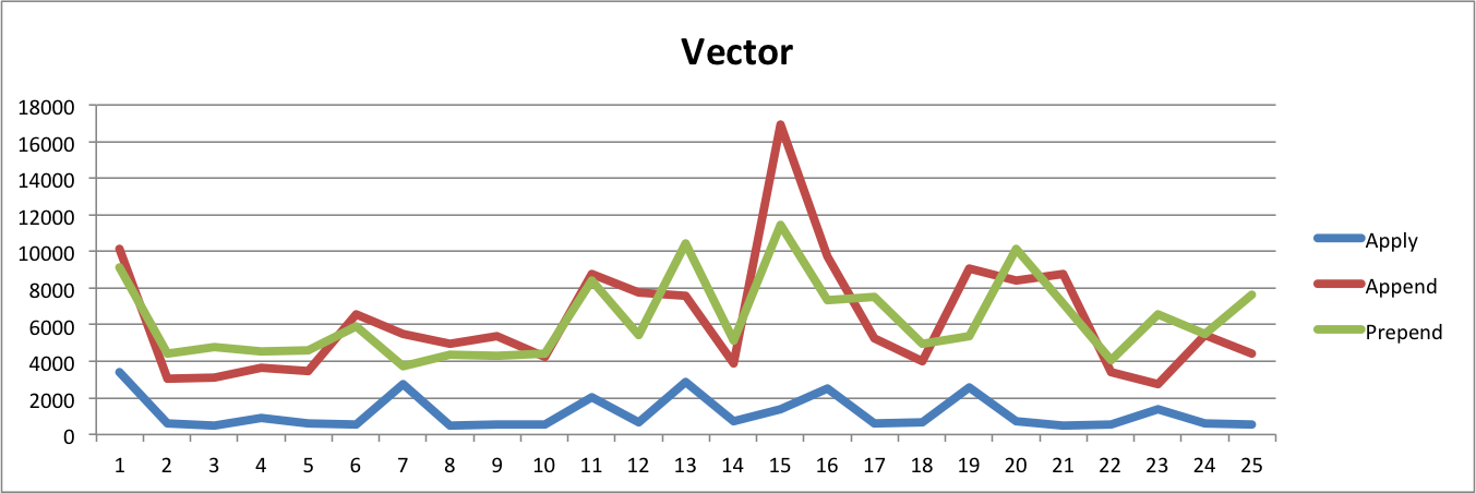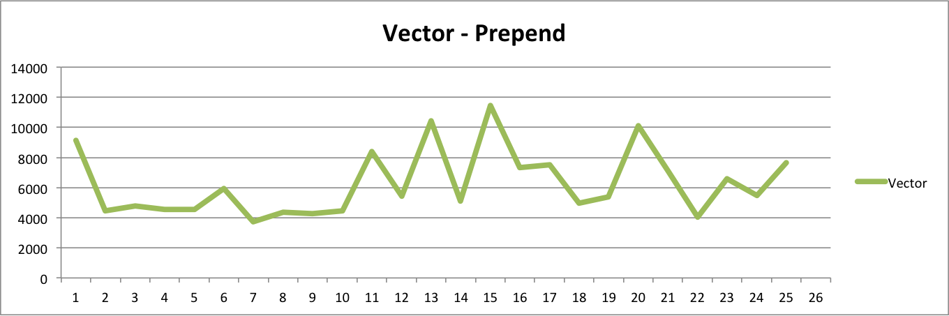 List is unbeatable when prepending an element to the collection: all it has to do is add a new pointer and connect the new element with the head of existing list…easy! A Vector has quite a good performance, very similar to the append study case thanks to its tree-ish structure. One the other side, Seq has a disastrous results due to the fact that all the indexes need to be updated when a new element is added at the beginning of the collection.